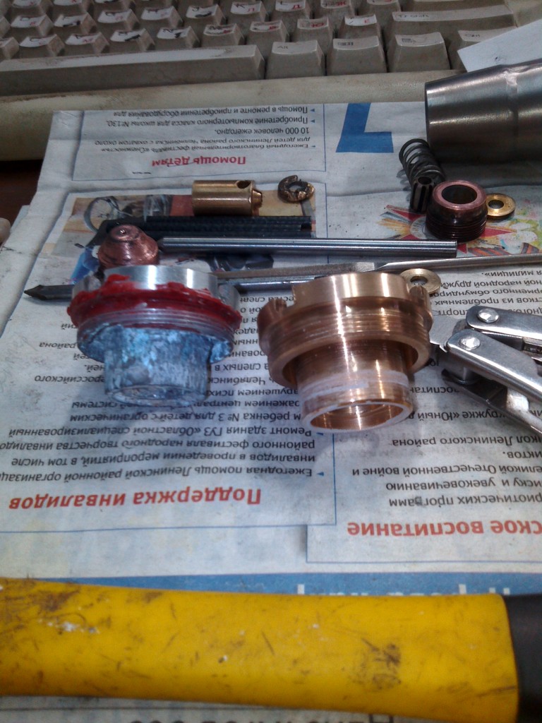 Добрый день. Приобрёл Плазар новый, 2006 года выпуска, но лежавший до этого времени на складе. На шестой заправке горелки произошла поломка: пошёл дым из внутренней полости горелки, пламя погасло. Разборка горелки вызвала затруднения: капролоновая деталь в задней части горелки выплавилась и шайбы, которые служат упором пружины тяги катода замкнули на испаритель. Выточил новую заднюю пробку из бронзы вместо дюрали (родная дюралевая за время хранения корродировала и в пластилин превратилась), а что там дальше делать - непонятно. Может, кто-нибудь скинет эскизик капронитовой детальки и как организовано уплотнение штока катода, чтобы в сторону кнопки запуска дуги пар не прорывался. У меня там всё сгорело, конструктив не ясен. Изолятор тоже покрошился при разборке, сделаю фторопластовый. Заранее огромное спасибо откликнувшимся.