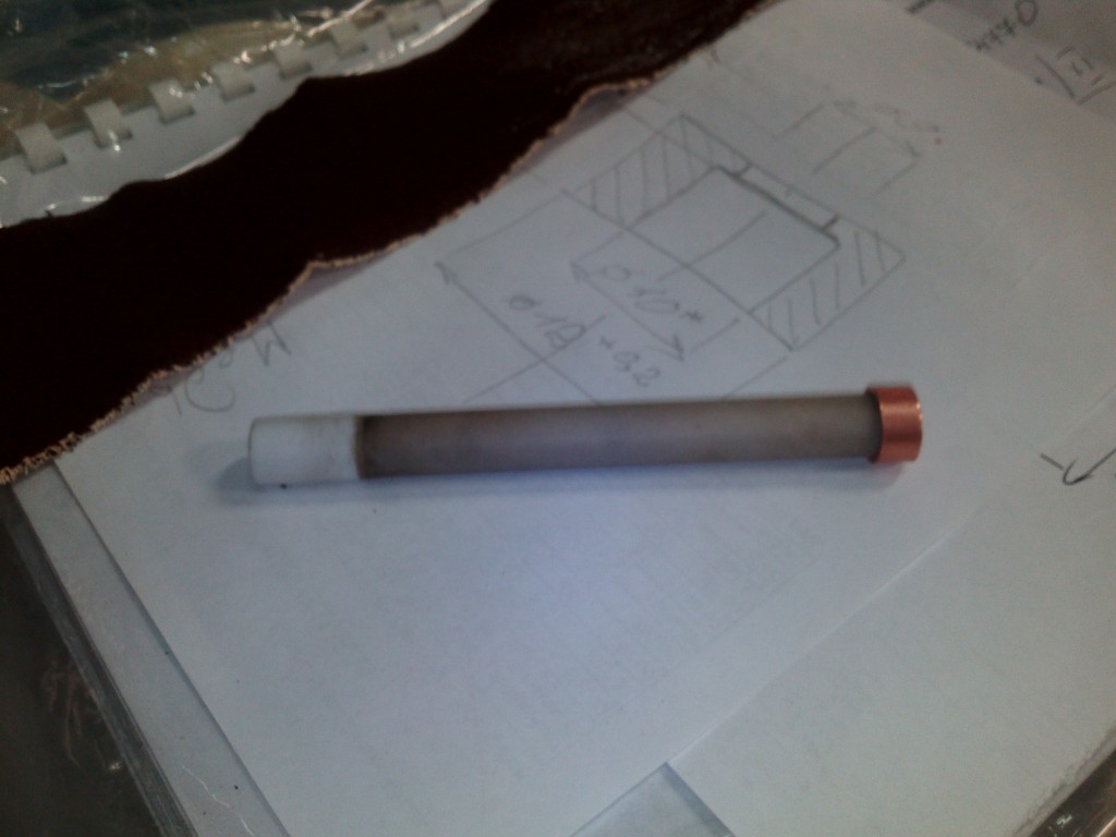 - Использовал остаток старого керамического изолятора. Слева нарастил до необходимой длины фторопластом (на поксиполе прилепил), а спереди одел медную трубку ф12х10 и длиной 6мм. Передний край медной трубки немного развальцевал, чтобы изолятор только не провалился в неё насквозь, а упёрся в развальцовку. От спадания этого медного колечка я его уже на изоляторе осторожно обжал в кулачках токарного патрона.
