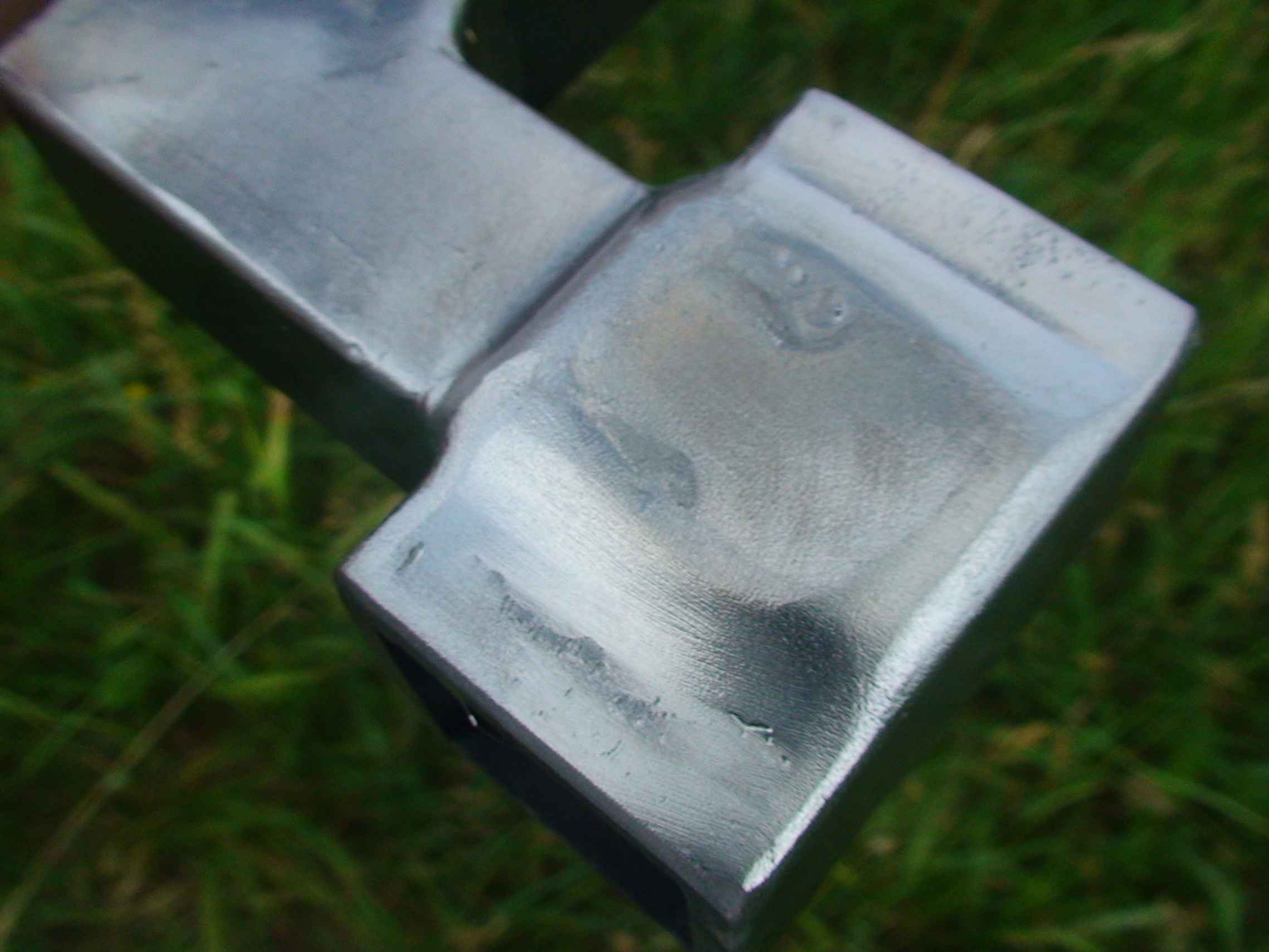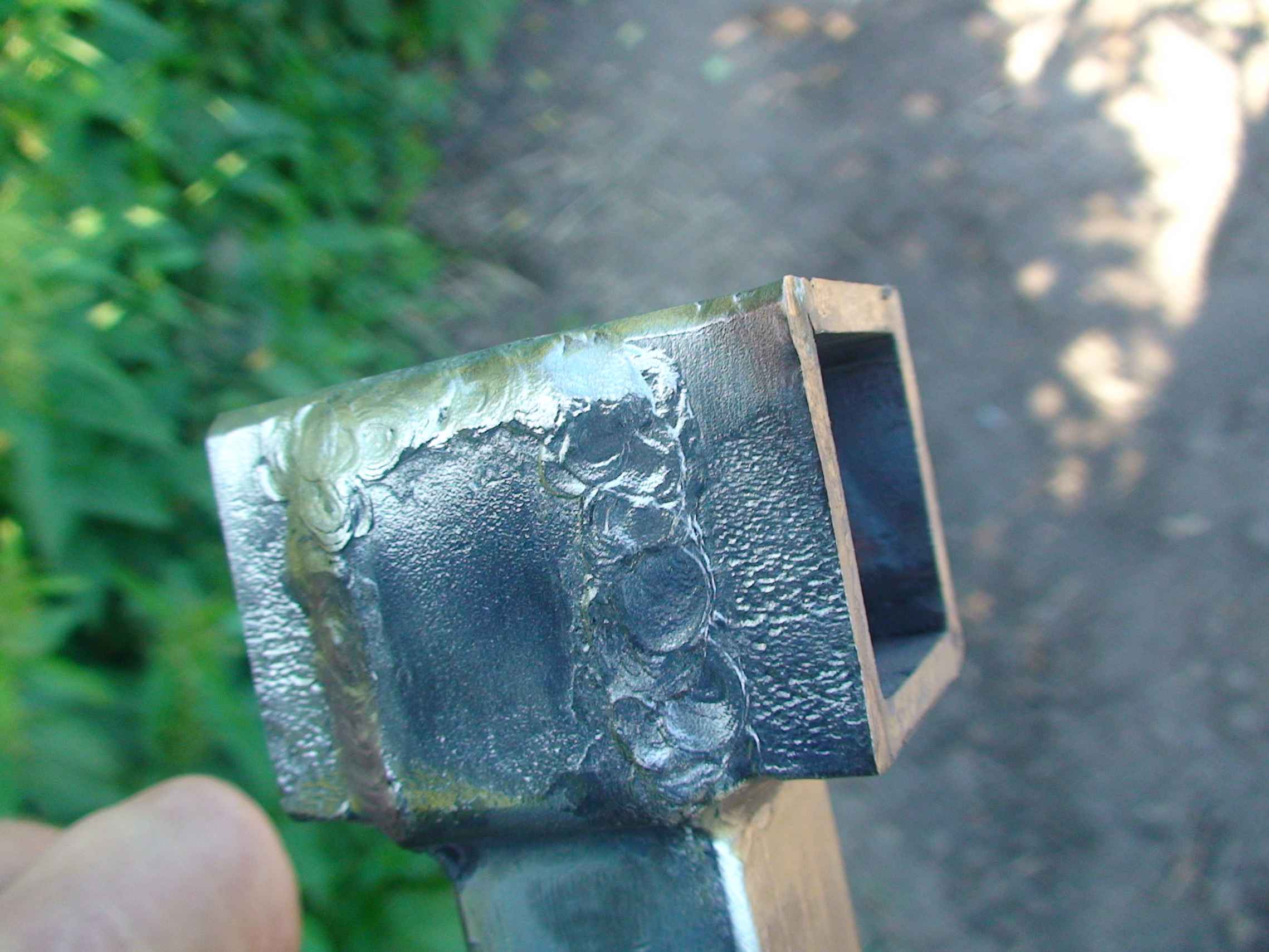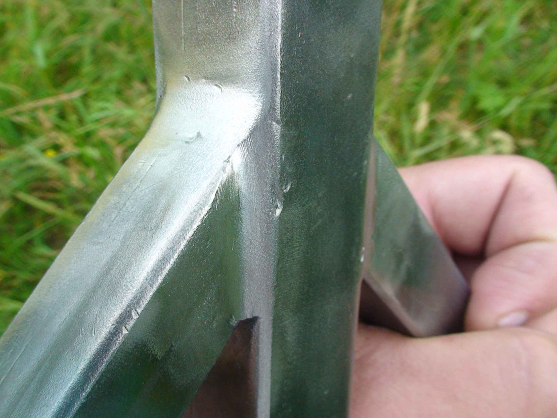 Плоскорез широкий был сварен ещё в 2011-2012. А вот ось из полдюймовой трубы для груза приварена в 2013-ом. Её шов зачищенный щеткой и не обработанный. А остальные швы обработаны болгаркой.