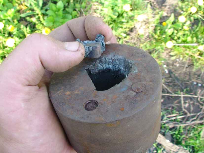 В общем понадобился груз на плоскорез широкий. Решил в качестве удержания груза взять за основу полдюймовую трубу. Нашел одходящую болванку. Вот только полдюймовое отверстие оказалось не сквозным. Попробовал сверлом расточить "под напильник" - результат нулевой. Попробовал ножевкой - не берет, только слабые царапинки. Даже звук при обработке очень звонкий. Сразу понятно, что сталь не простая. В общем, решил не мучаться, а резануть Горынычем... заодно испытать его на толстых толщинах.