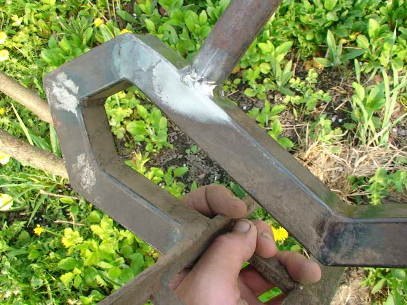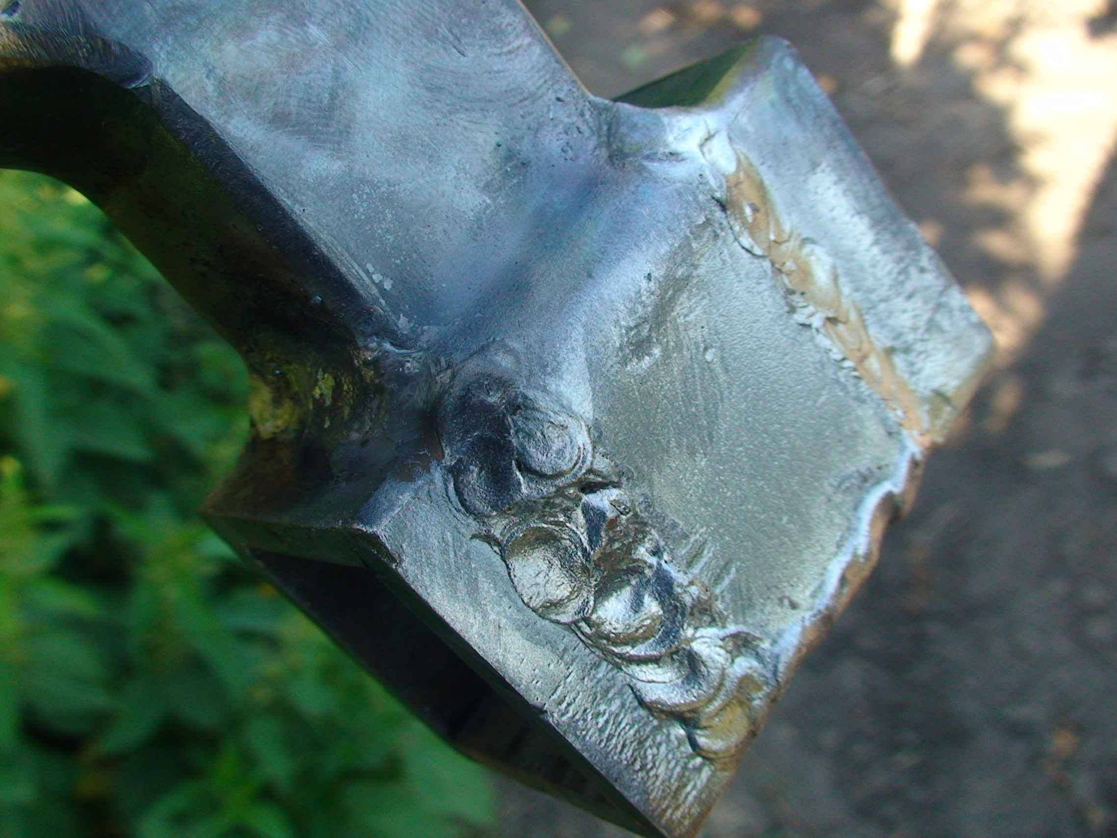 Плоскорез широкий был сварен ещё в 2011-2012. А вот ось из полдюймовой трубы для груза приварена в 2013-ом. Её шов зачищенный щеткой и не обработанный. А остальные швы обработаны болгаркой.